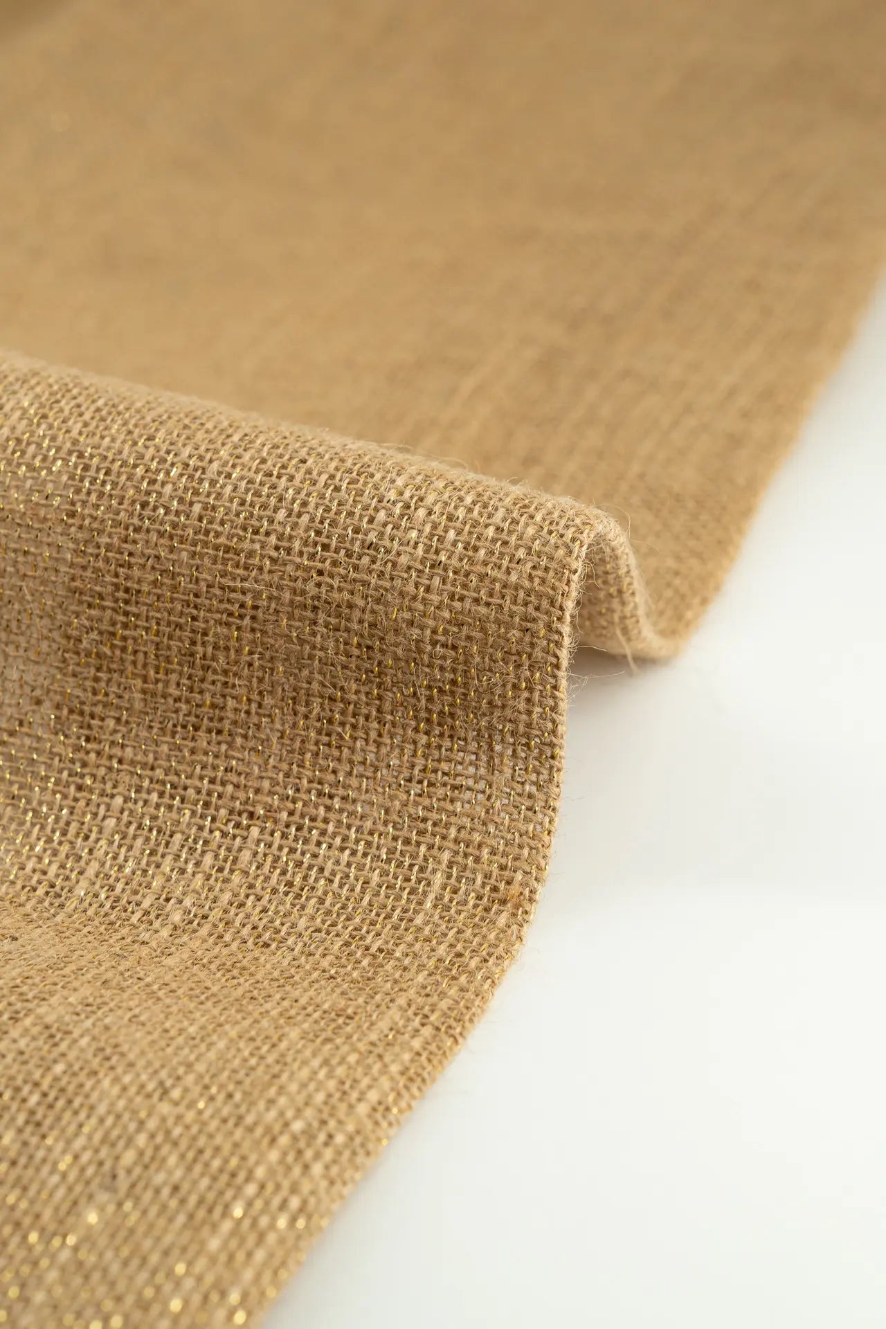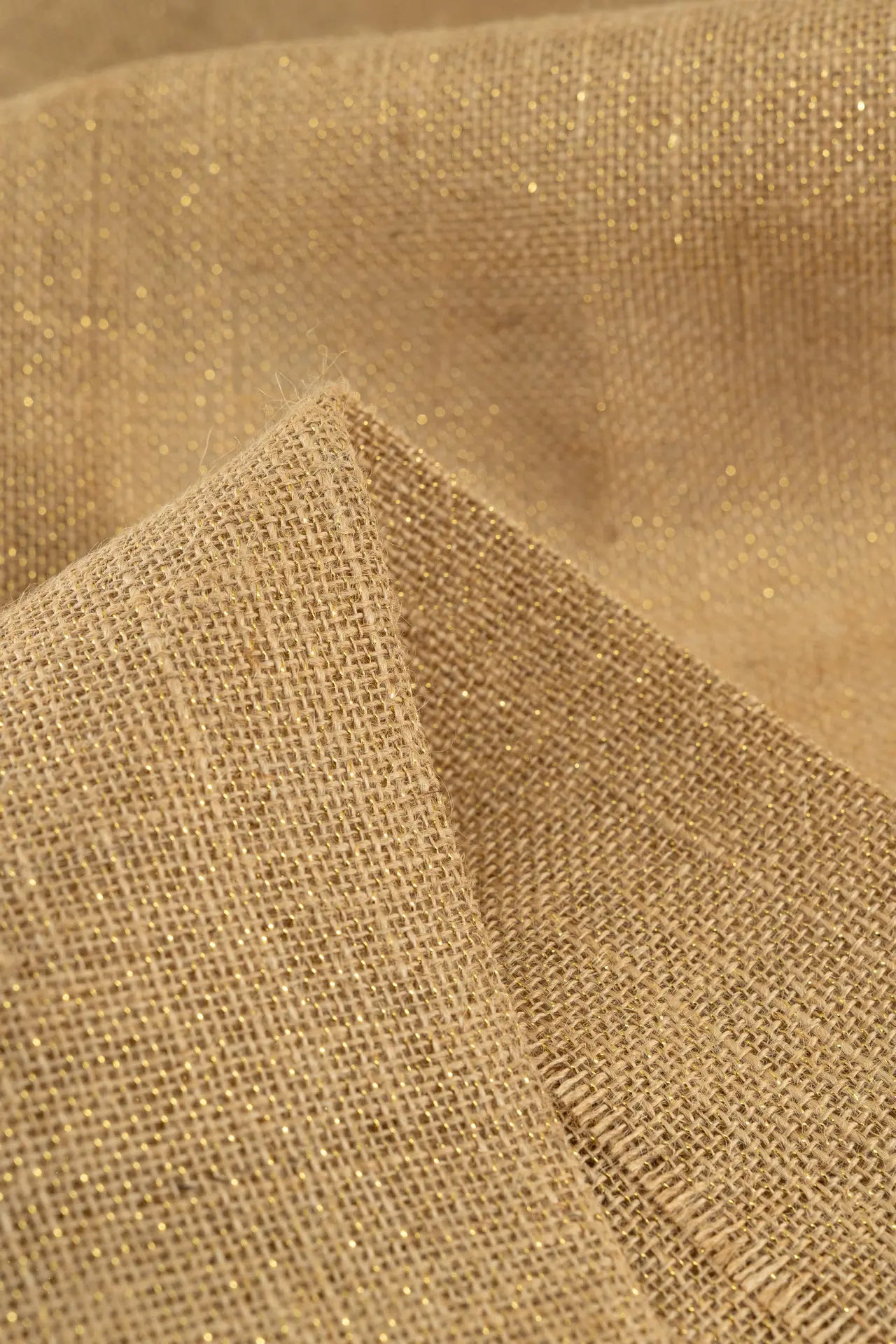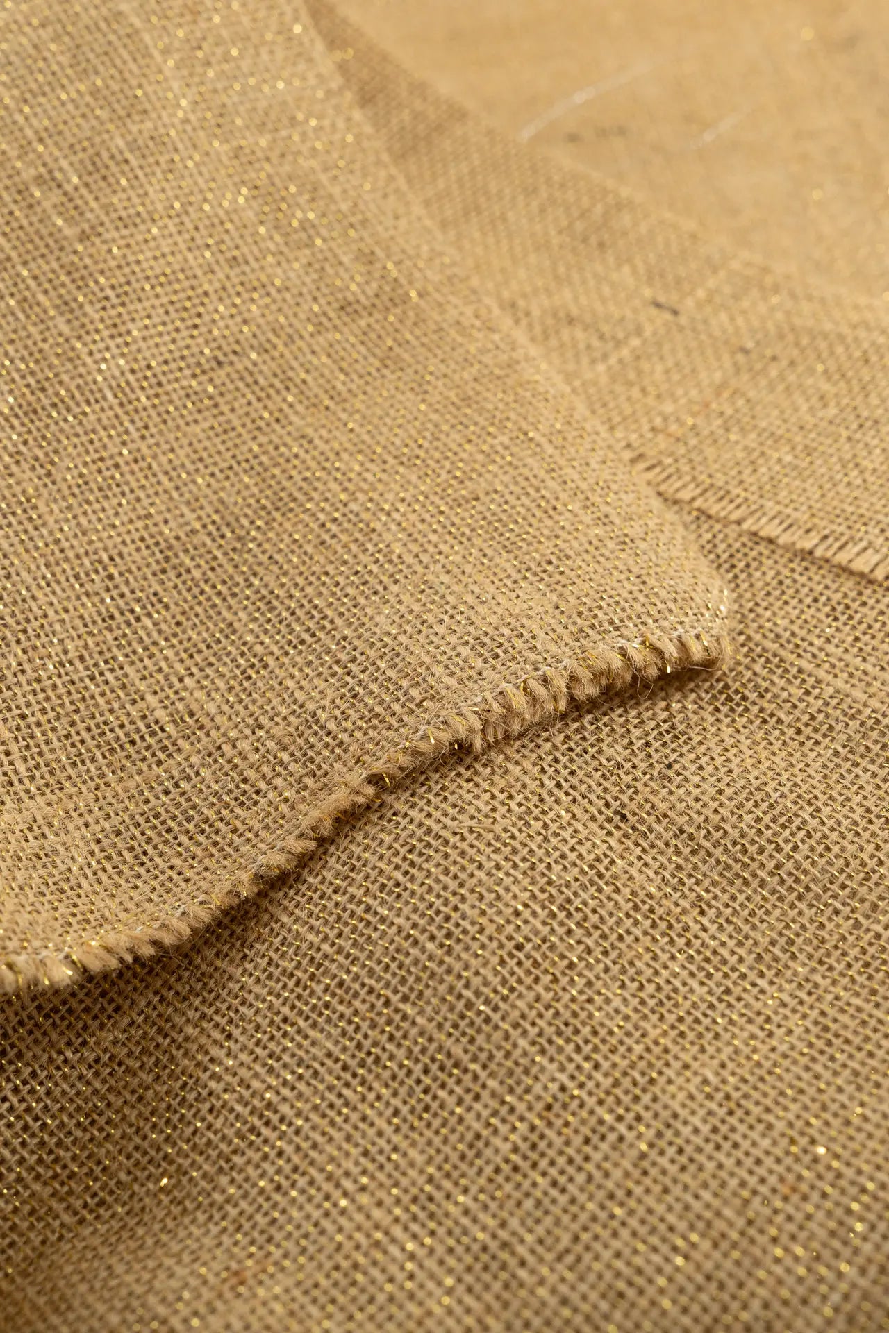 Tejido confeccionado en combinación de fibras naturales (yute) y de cadena larga (lurex).