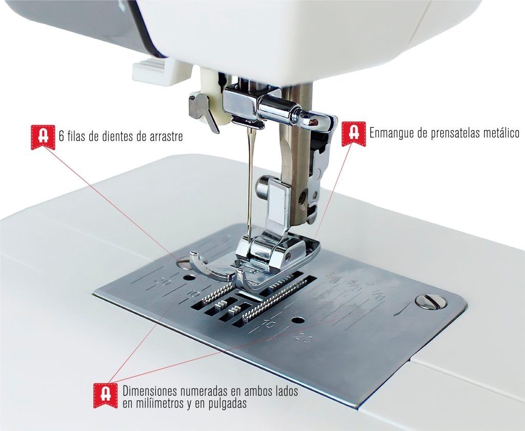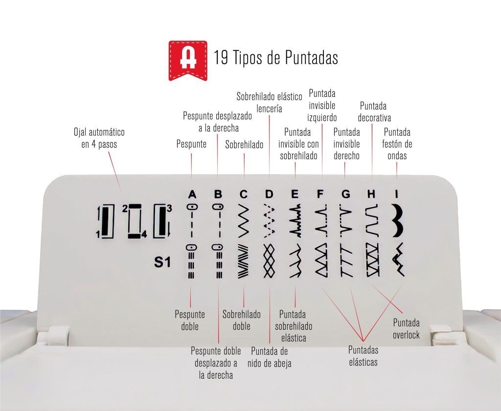 19 puntadas para todo tipo de labores: Ojal automático en 4 pasos, Básicas, Decorativas, Festones, Superautomáticas, Zig-zag.
