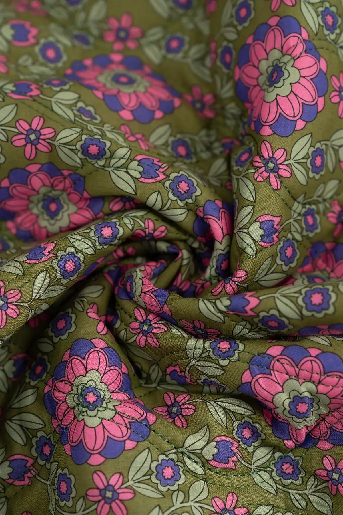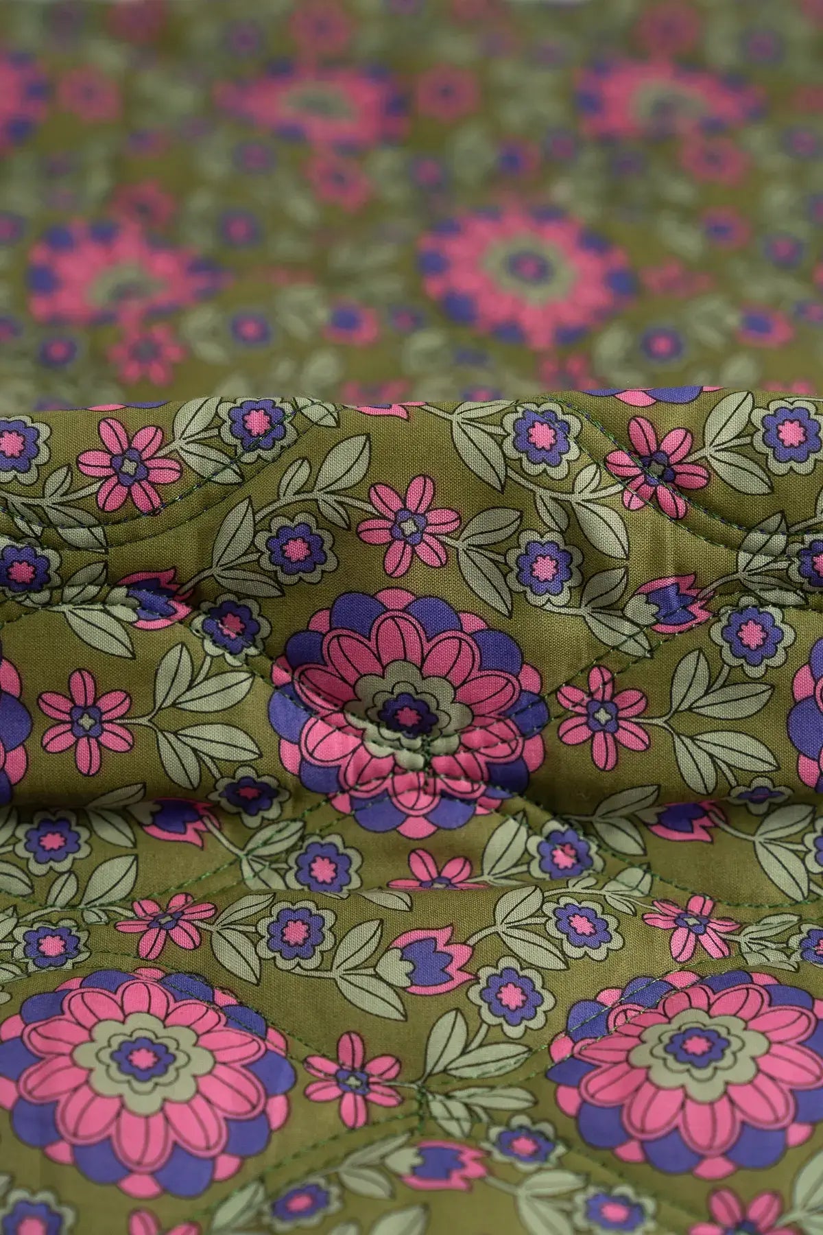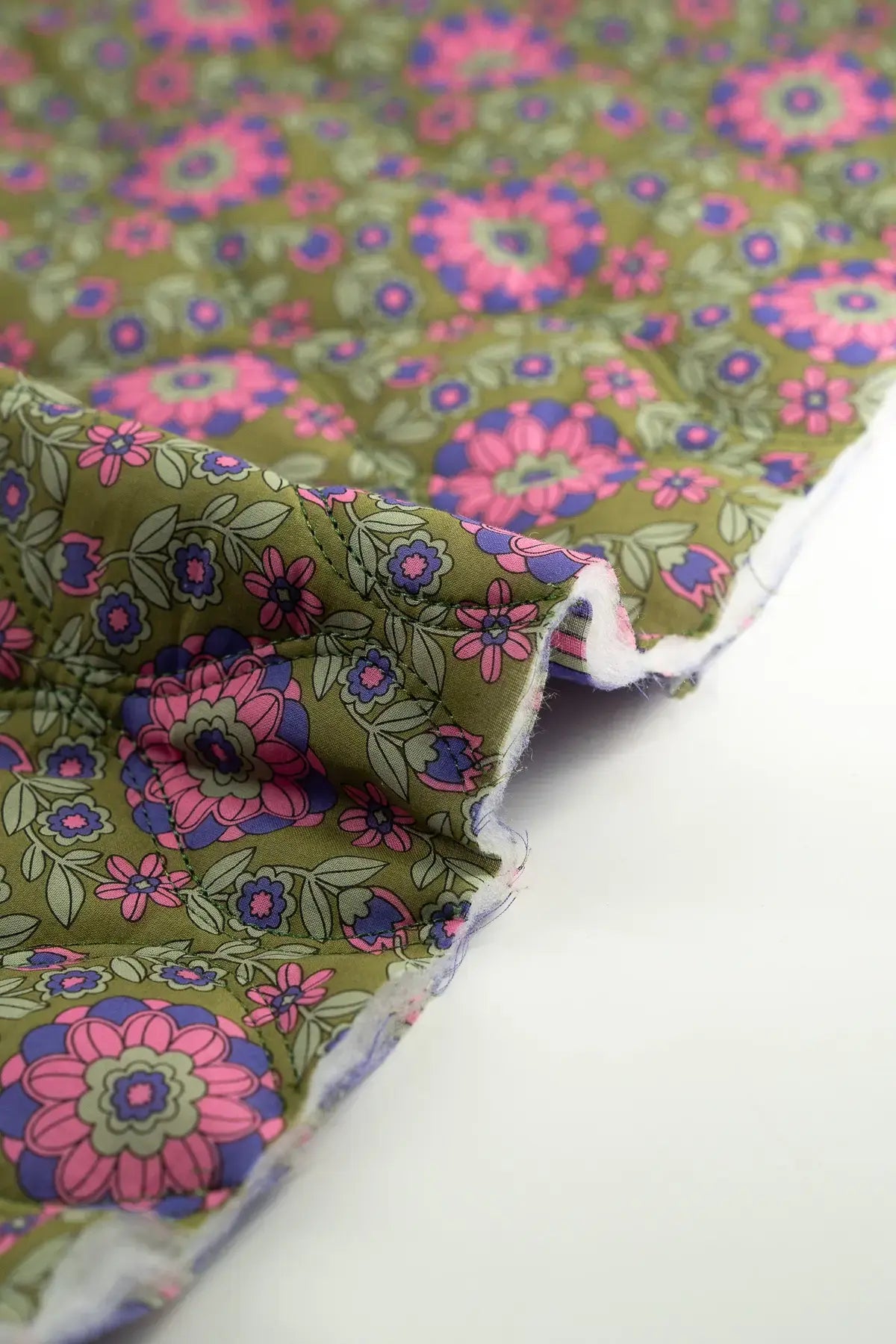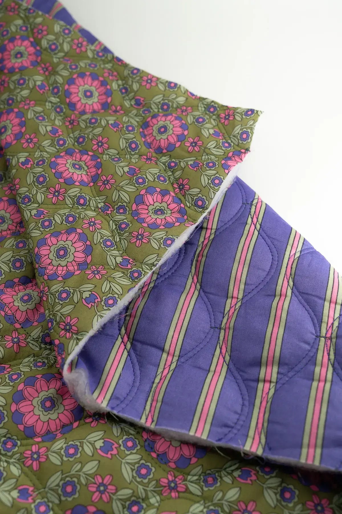 Tejido acolchado con padding y stiching en rombo, está confeccionado en voile reversible, una cara con estampado floral y en otra de rayas. Es indicado para la confección de prendas de abrigo; su composición fibras de cadena larga hacen dan calor inmediato