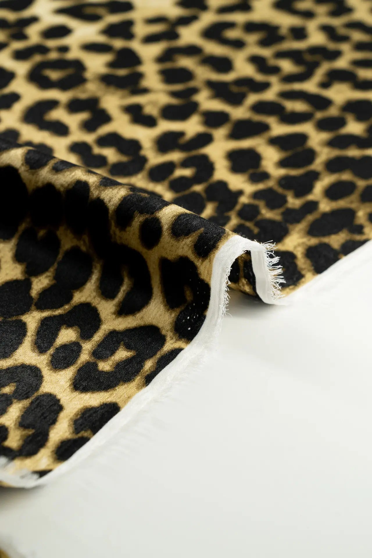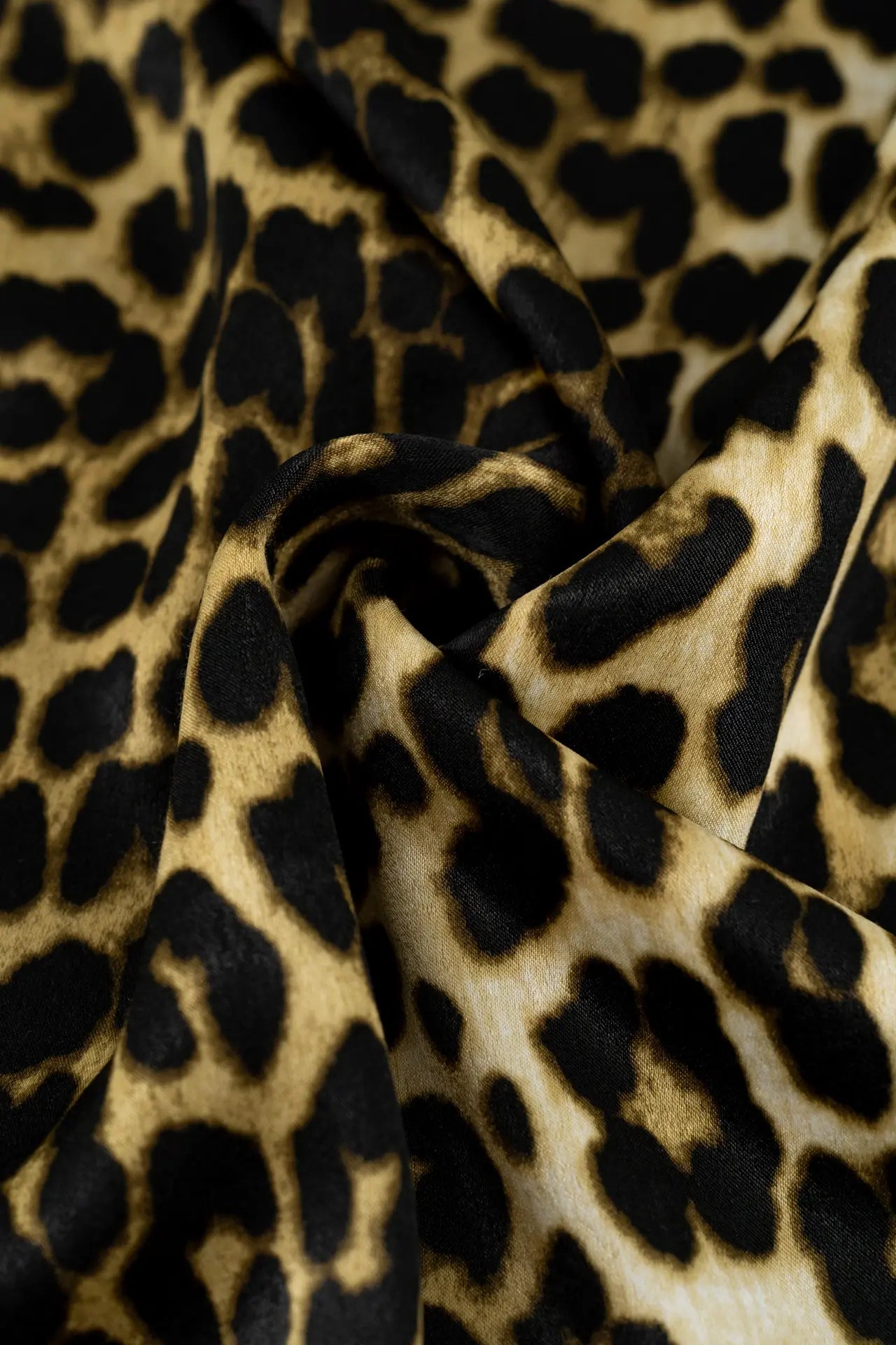 Satén confeccionado en fibras de cadena larga con estampado de animal print